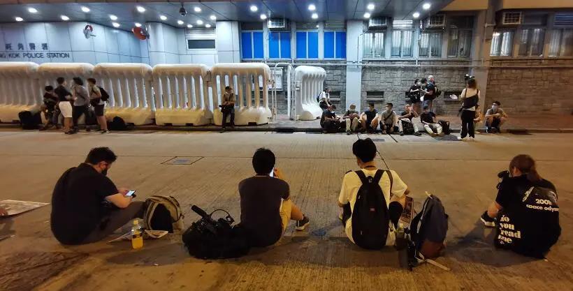 接近午夜,大约11点半的时候,律师和何俊仁抵达警署,现场气氛开始紧张起来。记者们都拥到大门前,举起相机,聚精会神地紧盯着门口,即使汗流浃背,也不敢随意移动,一俟人影在警署门口晃动,快门声就会此起彼落,一旦发现所摄对象并不是目标主角,大家又会很失望地起哄喝倒彩。