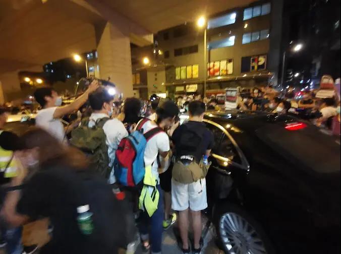大堆镜头一直围着黎智英的车子拍个不停,车子幾乎走不动,要由区议员曾健成(阿牛)在前面不停地拍打车头,示意大家远离,车子才能慢慢挪动。从警署到拐出大马路,不到50米的路程开了十幾分钟,才能顺利离开。