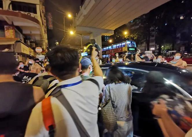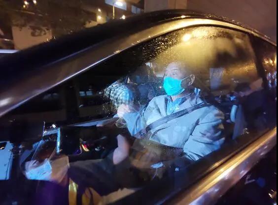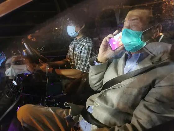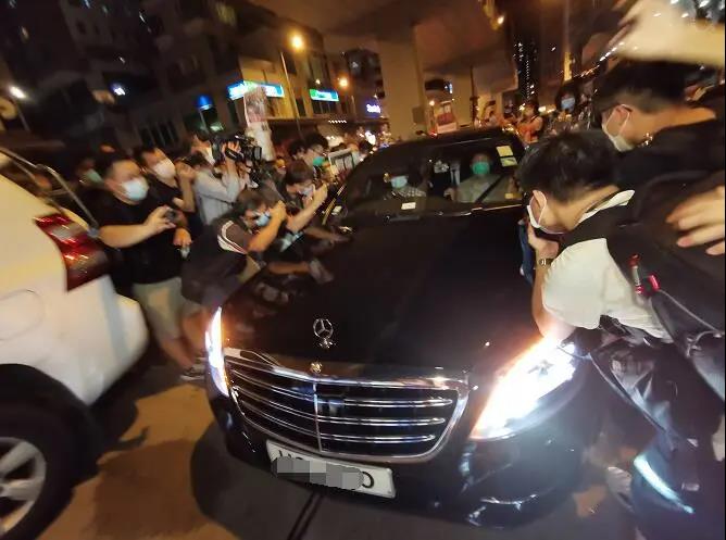 黎智英一行也是好不容易才挤上了停在路边的车子,他坐在司机旁边的位置,还是穿着被逮捕时候的浅蓝色西装。