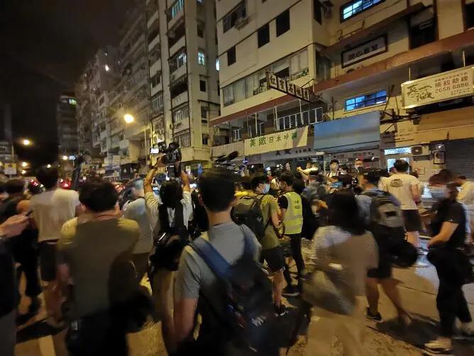 在等了五个多小时後,凌晨大约12:20,黎智英在律师和何俊仁的陪同下步出警署,现场两百多名记者一拥而上,场面极度混乱,连身经百战的小记也被挤得站不稳,差点掉鞋子摔跟头,幸好旁边有行家眼明手快,把小记从人群中拉了起来,否则很有可能发生人踩人的危险。
