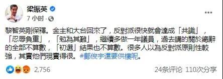 黎智英获准保释後,梁振英在社交媒体fb上发帖回应称,黎智英刚保释,金主和大台回来了,反对派很快就会达成「共识」,「忍辱负重」,「勉为其难」,继续多做一年议员,过去讲的关於总辞的全部不算数,「初选」结果也不算数。很多人以为反对派原则性较强,其实他们现实得很。