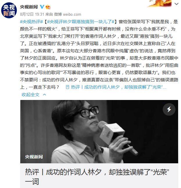 文章指,林夕多年來一直參與政治運動,並從香港移居到台灣,曾填寫支持「佔中」的歌曲,撰寫批評、嘲諷內地的文章,受到「港獨」的追捧。