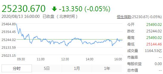【香港商报网讯】8月13日消息,美股走高,纳指大涨2%,腾讯营收、净利超预期。今日早盘,恒指高开后,全天窄幅震荡调整。截至收盘,恒指跌0.05%,报25230.67点;红筹指数涨1.75%,国企指数涨0.28%。