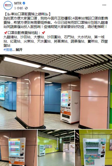口罩自動售賣機地點:九龍塘站、沙田站、大學站、沙田圍站、石門站、大水坑站、第一城站、紅磡站、尖東站、天水圍站、將軍澳站、調景嶺站、寶琳站、西營盤站。