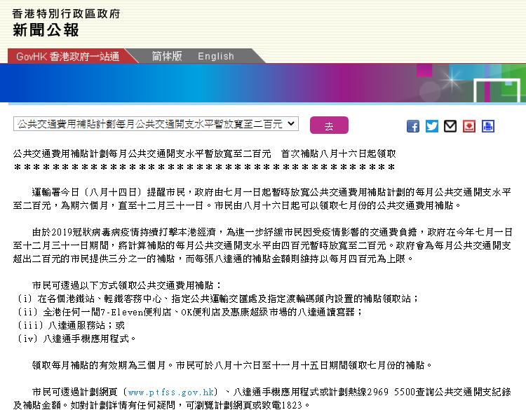 由於疫情持續打擊本港經濟,為進一步紓緩市民因受疫情影響的交通費負擔,政府在今年七7月1日至12月31日期間,將計算補貼的每月公共交通開支水平由400元暫時放寬至200元。政府會為每月公共交通開支超出200元的市民提供三分之一的補貼,而每張八達通的補貼金額則維持以每月400元為上限。