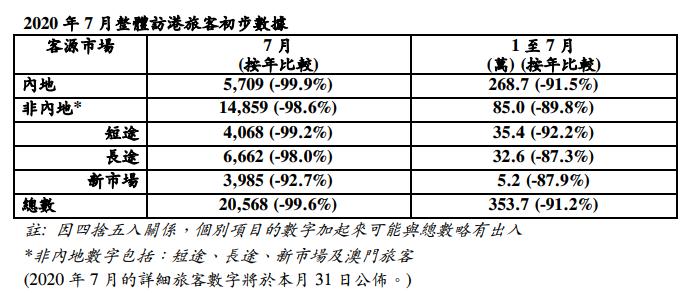 旅發局數據顯示,來自各地區的旅客均大跌九成以上,其中,內地旅客按年續跌99.9%至5709人次,按月跌14%。首7個月,整體訪港旅客按年跌91.2%至353.7萬人次,內地旅客跌91.5%至268.7萬人次;非內地旅客跌89.8%至85萬人次,當中7月按年跌98.6%至1.5萬人次。