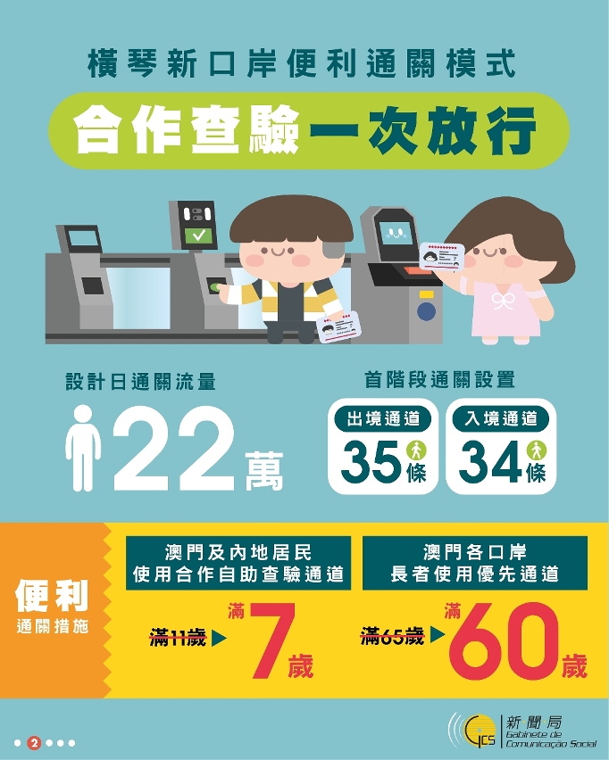 當局表示,為配合新大樓使用,已要求電訊商擴大無線網絡服務至位於橫琴新邊檢大樓的澳方區域,而可使用自助過關通道的年齡,由11歲下調至7歲,長者通道的年齡,就由65歲下調至60歲,與珠海規定看齊。