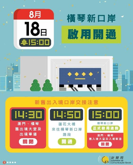 澳門當局表示,為了新舊口岸交接順利,原本設在澳門路氹城的出入境大樓出境大堂和車道,將於明天下午2點半開始禁止進入,待最後一班接駁巴士或出境車輛抵達位於珠海橫琴的原來口岸後,便會關閉入境大堂和車道。連接澳門同橫琴的蓮花大橋亦會隨即封閉,待確認清空所有旅客和車輛後,預計在下午2時50分重開。