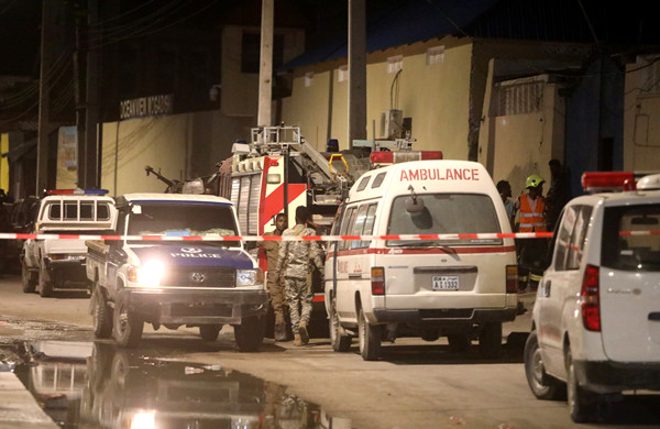 在索马里首都摩加迪沙,救护车在事发地点附近等待收治伤员。新华社