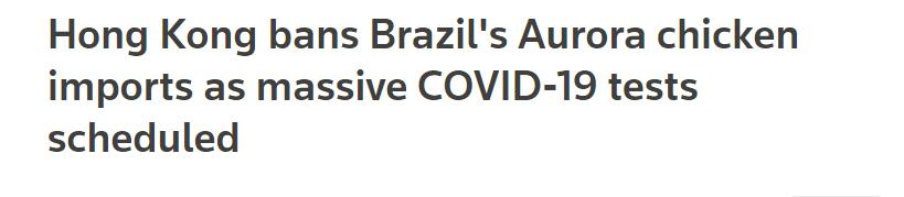 8月13日,深圳龙岗区排查发现,一个由从巴西进口的急冻鸡翼表面样本,对新冠病毒检测呈阳性。香港亦有從巴西進口急凍雞翼。据路透报道,涉事的巴西凍肉廠商周一(17日)證實,香港已暫停相關廠房的禽肉進口。