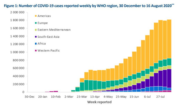 從6月底至8月10日,東地中海區域的病例數量出現下降,但過去七天新增病例增加了10%。西太平洋區域的死亡病例大幅增加,但僅占全球新增死亡病例的1%,非洲區域上報的確診及死亡病例均出現下降。歐洲區域病例逐漸增加,法國、德國、荷蘭、西班牙和英國等國出現疫情複發,比利時、丹麥和德國等國的一些疫情集群出現在肉類加工包裝場所。