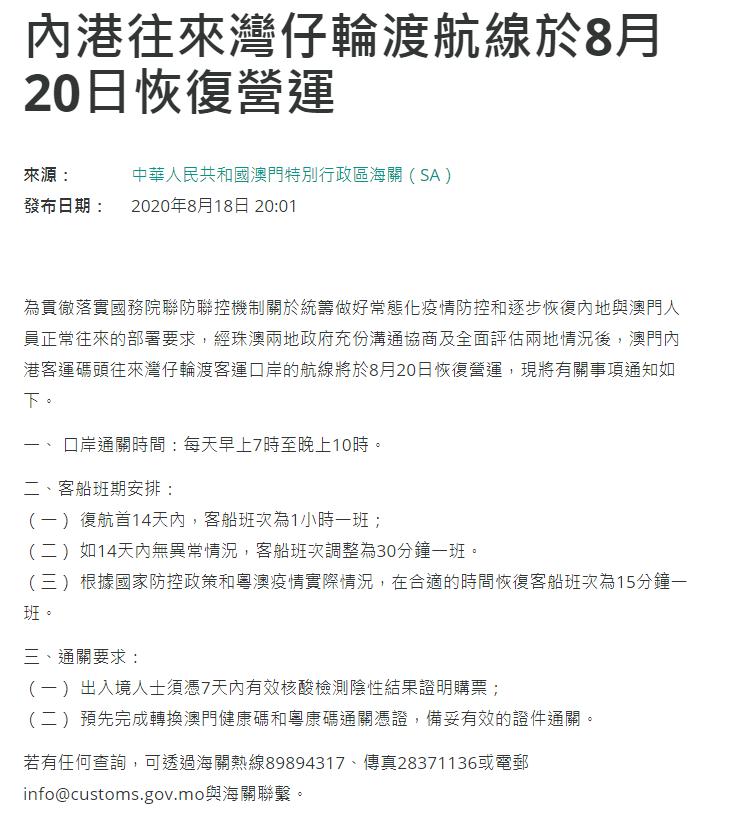 澳門海關18日表示,為貫徹落實國務院聯防聯控機制關於統籌做好常態化疫情防控和逐步恢復內地與澳門人員正常往來的部署要求,經珠澳兩地政府溝通及全面評估後,內港客運碼頭往來灣仔輪渡客運口岸的航線將於8月20日起恢復營運。