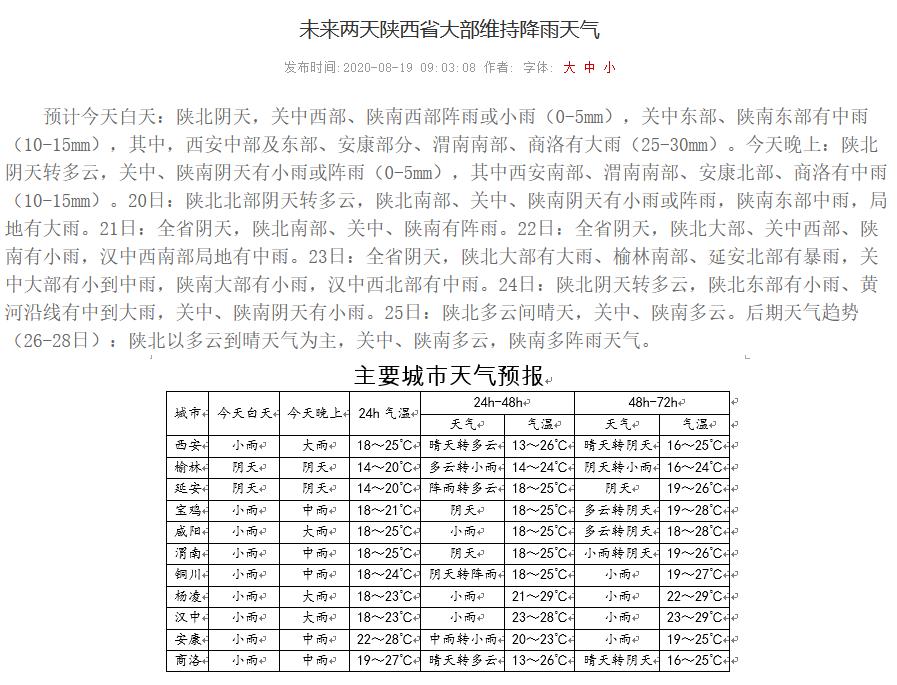 据陕西省气象局发布信息,未来几天,陕西多地仍将出现降雨天气,局地有大到暴雨,建议做好应对防御工作,减少户外作业,提醒广大群众注意防范塌方、滑坡、泥石流等灾害。