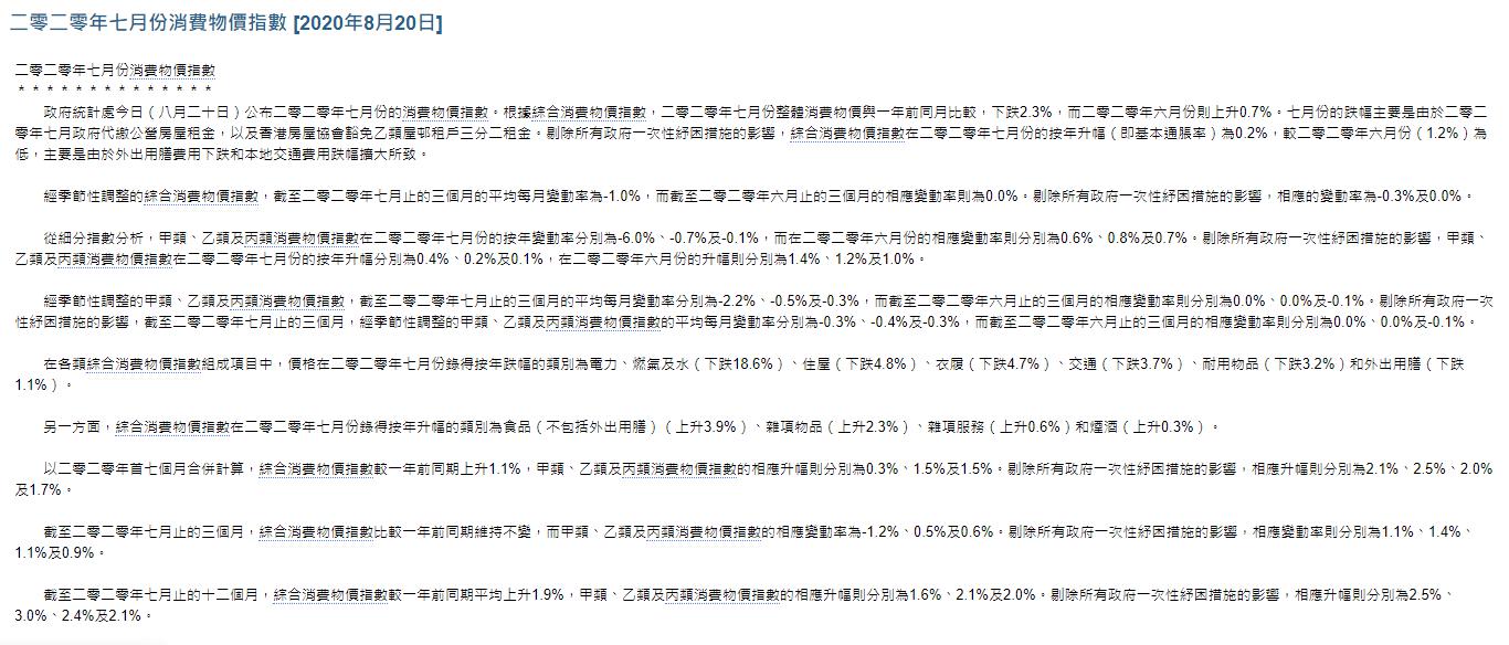 政府統計處公布,7月整體消費物價按年下跌2.3%,6月則上升0.7%。剔除所有政府一次性紓困措施的影響,7月基本通脹率為0.2%,較6月的1.2%為低。