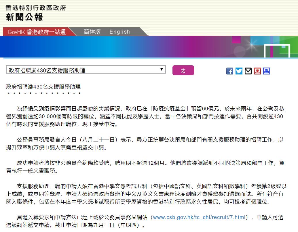 港府表示,為紓緩受到疫情影響而日趨嚴峻的失業情況,已在「防疫抗疫基金」預留60億元,於未來兩年,在公營及私營界別創造約3萬個有時限的職位,涵蓋不同技能及學歷人士。