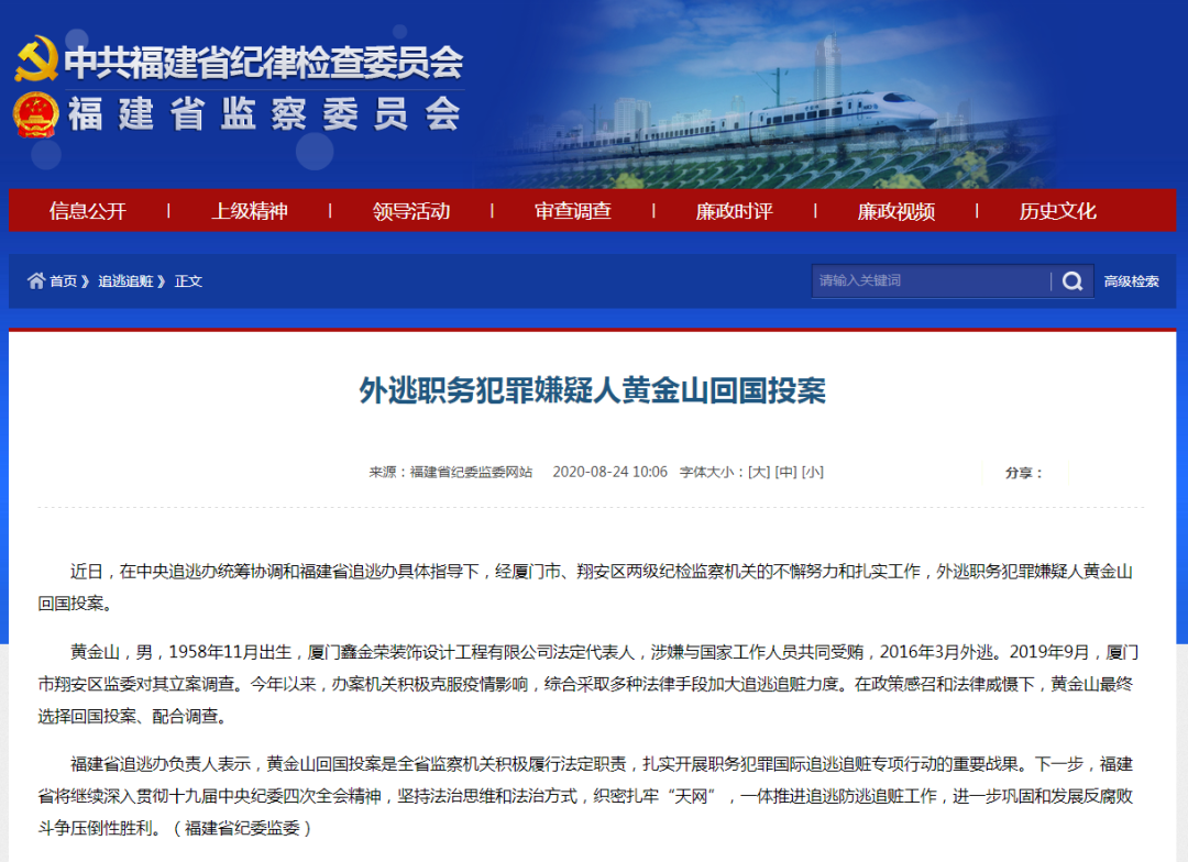 近日,在中央追逃办统筹协调和福建省追逃办具体指导下,经厦门市、翔安区两级纪检监察机关的不懈努力和扎实工作,外逃职务犯罪嫌疑人黄金山回国投案。