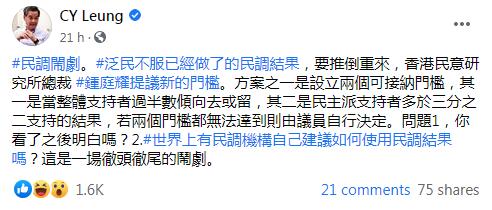 梁振英稍早於社交网站发文讽刺:世界上有民調機構自己建議如何使用民調結果嗎? 這是一場徹頭徹尾的鬧劇。