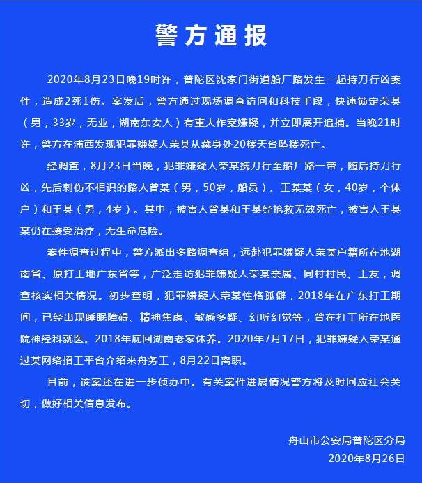 中新网8月27日电 浙江舟山市公安局普陀区分局官方微信26日发布警情通报,2020年8月23日晚19时许,浙江舟山普陀区沈家门街道船厂路发生一起持刀行凶案件,造成2死1伤。案发後,警方通过现场调查访问和科技手段,快速锁定荣某(男,33岁,无业,湖南东安人)有重大作案嫌疑,并立即展开追捕。当晚21时许,警方在浦西发现犯罪嫌疑人荣某从藏身处20楼天台坠楼死亡。