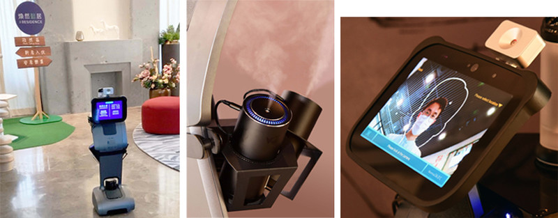 在交樓期間,市建局在煥然懿居辦事處安排一台抗疫機械人(左圖),加強防疫。這台機械人配置消毒噴霧(中),可定時為場地消毒;它亦安裝了紅外線體溫探測功能(右圖),自動為業主及同行親友量度體溫。