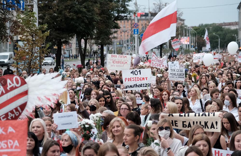 白俄羅斯示威持續,周六再有數千人在首都明斯克遊行,當中大部分是女性,她們舉起代表反對派的白紅旗,要求總統盧卡申科下台,及調查警察被指對示威者使用過度武力。防暴警察組成人鏈,企圖阻止示威者前進,但未能成功。