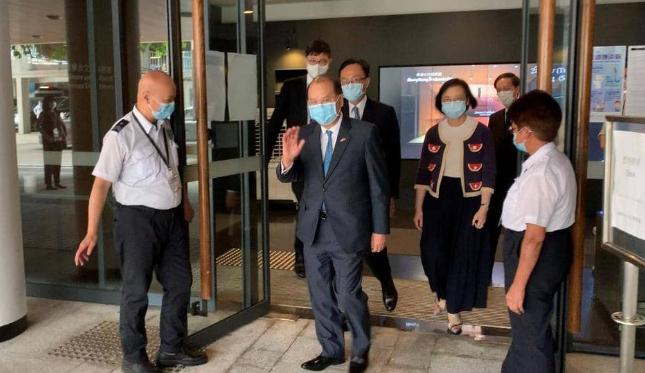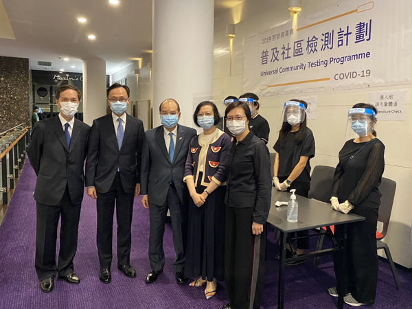 政務司司長張建宗(前排左三)今日(八月三十一日)在公務員事務局局長聶德權(前排左二)和食物及衞生局局長陳肇始教授(前排右二)陪同下,視察在大會堂設立的社區檢測中心。