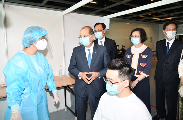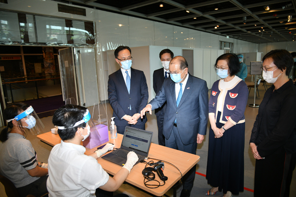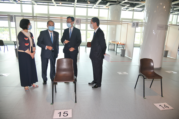 政務司司長張建宗今日(31日)在公務員事務局局長聶德權和食物及衞生局局長陳肇始的陪同下,視察在大會堂設立的社區檢測中心,了解中心已作好的一切準備。