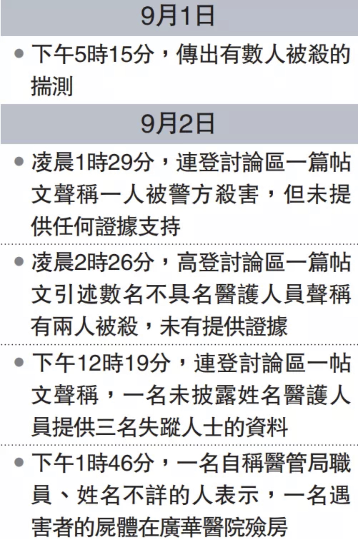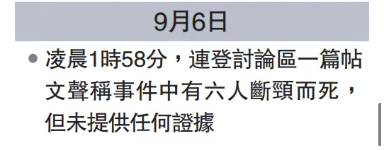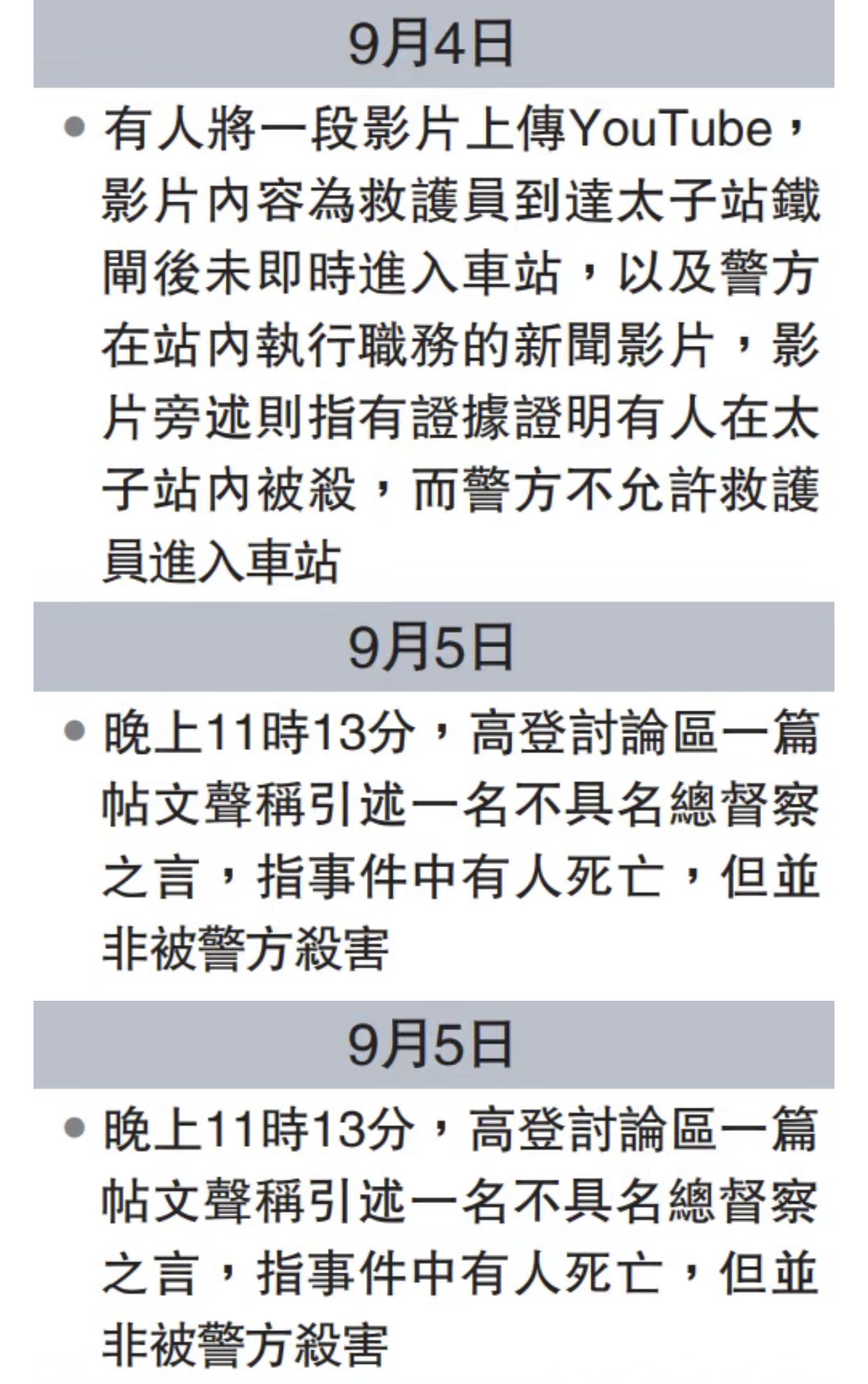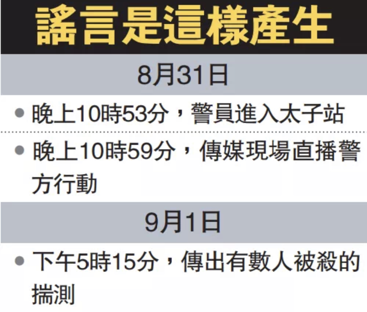 去年8月31日,暴徒進入太子站在港鐵列車車廂內換衫,有市民與他們發生爭執後報警。警方到太子站執法,一度圍封港鐵站,而見習救護主任將傷者人數由10人修正為七人。如此簡單的事實,暴徒卻如獲至寶,不斷將「8·31太子站死人」的謠言升級。