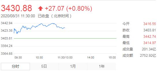8月31日,星期一,农历七月十三。今日三大指数集体走强,沪指高开后,走出逐波上升走势,最高涨幅超1%,沪深300指数走势强劲,触及自2015年以来新高。盘面上,大金融板块较为活跃,化工、数字货币板块也有冲高,白酒股再度走强,贵州茅台站上1800元关口,航运、养殖业、种植业居板块跌幅榜前列。截止中午收盘,沪指报3430.88点,涨0.8%,成交额为2753亿元;深成指报13937.01点,涨0.62%,成交额为3780亿元;创指报2767.51点,涨0.35%,成交额为1609亿元。