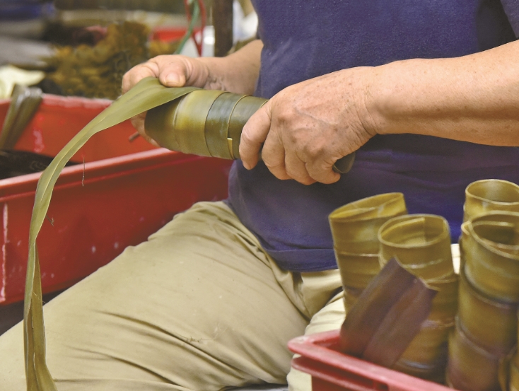 蘆兜葉因帶香味柔軟耐用長度十足,是蘆兜糉的靈魂。但長滿刺簕就算先以利刀削之,採摘時手部一樣有中刺受傷機會,增加了生產難度。葉子採摘後先以大鐵鍋用水煮去草腥,再以竹竿壓至扁平,隨後晾曬吹乾為止。每五條葉可紮成一卷來備用,放上一年也沒問題。