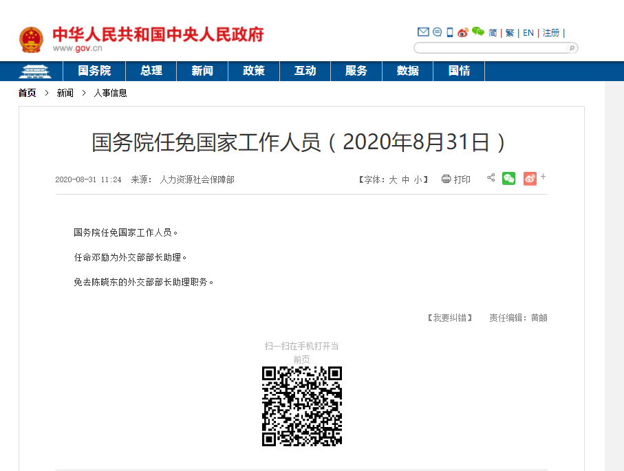 据中国政府网8月31日消息,国务院任免国家工作人员,任命邓励为外交部部长助理。免去陈晓东的外交部部长助理职务。