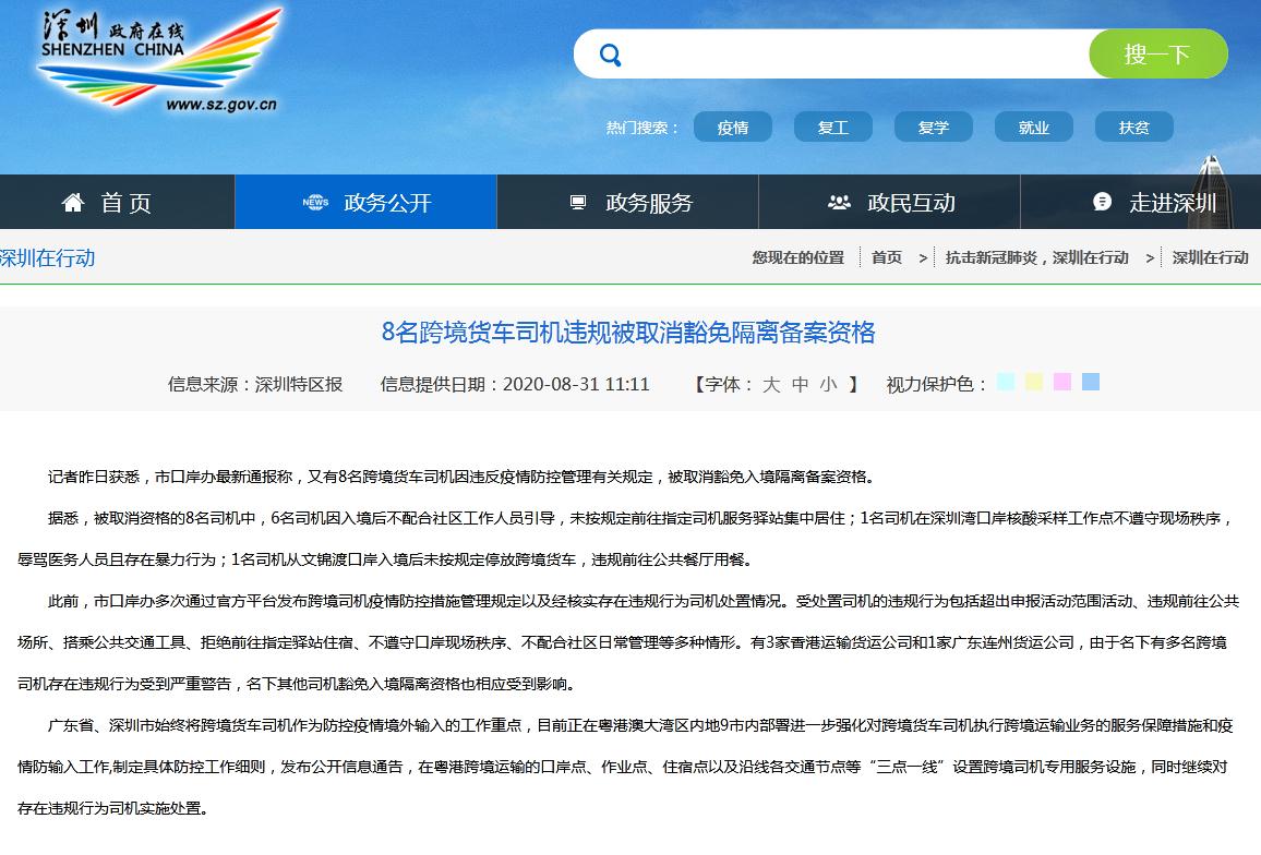 据通报,被取消资格的8名司机中,有6名司机是由於入境後不配合社区工作人员引导,未按规定前往指定司机服务驿站集中居住;1名司机是由於在深圳湾口岸核酸採样工作点不遵守现场秩序,辱骂医务人员且存在暴力行为;1名司机是由於自文锦渡口岸入境後未按规定停放跨境货车,违规前往公共餐厅用餐。