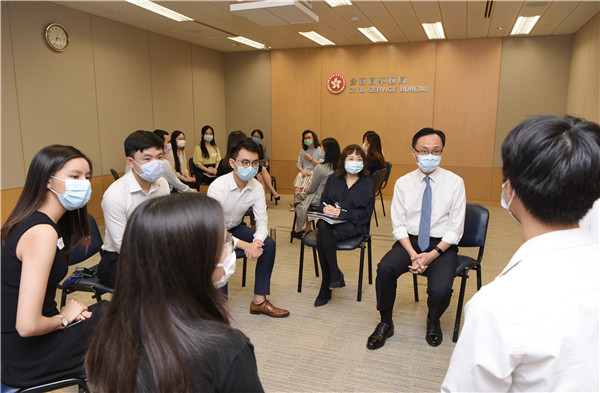 公務員事務局局長聶德權(右二)今日(八月三十一日)與參加政務職系暑期實習計劃的大學生見面,了解他們的實習體驗