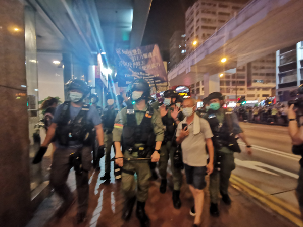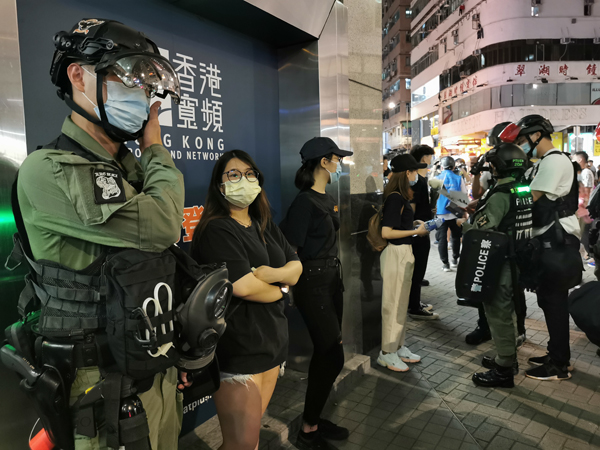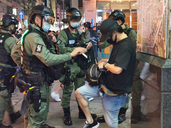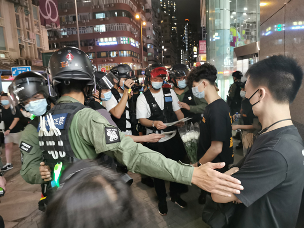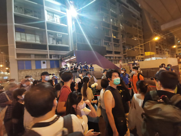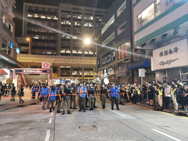 傍晚近7時,現場有身穿黑衣人士聚集,有人高叫「港獨」口號,警方廣播警告在彌敦道及太子道西的人群散去不准停留,又要求傳媒代表身穿反光背心。警員又截查附近市民,搜查隨身物品,警員與在場停留人士發生爭拗。記者 木子