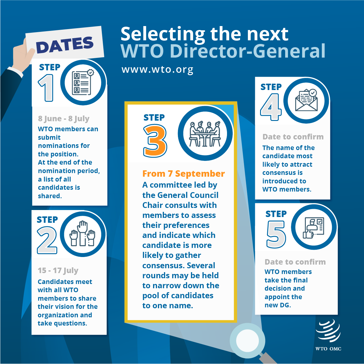 目前,来自墨西哥、尼日利亚、埃及、摩尔多瓦、韩国、肯尼亚、沙特阿拉伯和英国的八位候选人正在竞选世贸组织新总干事,竞选程序将于9月7日结束,之后总理事会将与世贸组织各成员举行多轮磋商,询问其意向人选,逐渐缩小范围至一名最终候选人。