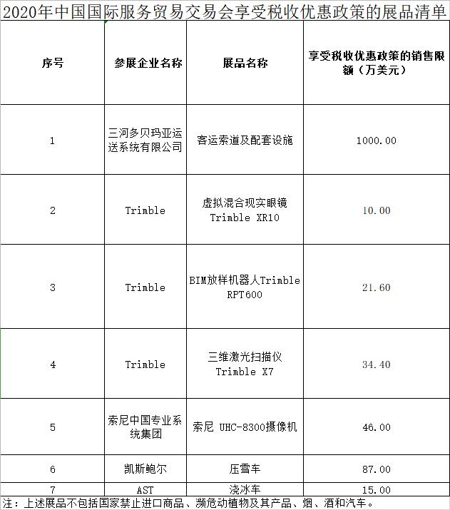 所列参展企业享受上述税收优惠政策的销售限额不超过列表额度。其他参展企业享受税收优惠政策的销售限额不超过2万美元,具体企业名单由北京市国际服务贸易事务中心确定(见下图)。