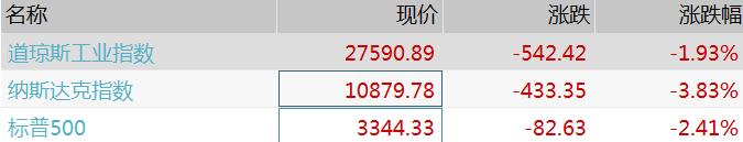 纳斯达克综合指数下跌3.8%,道琼斯工业、指数下跌超500点,跌幅超过1.9%。标准普尔500指数下滑2.4%。
