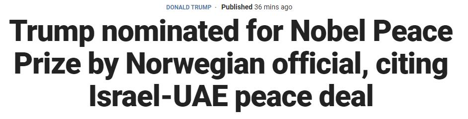 据福克斯新闻消息,特朗普被挪威议会议员提名2021年诺贝尔和平奖。理由是参与斡旋以色列与阿联酋关系正常化。