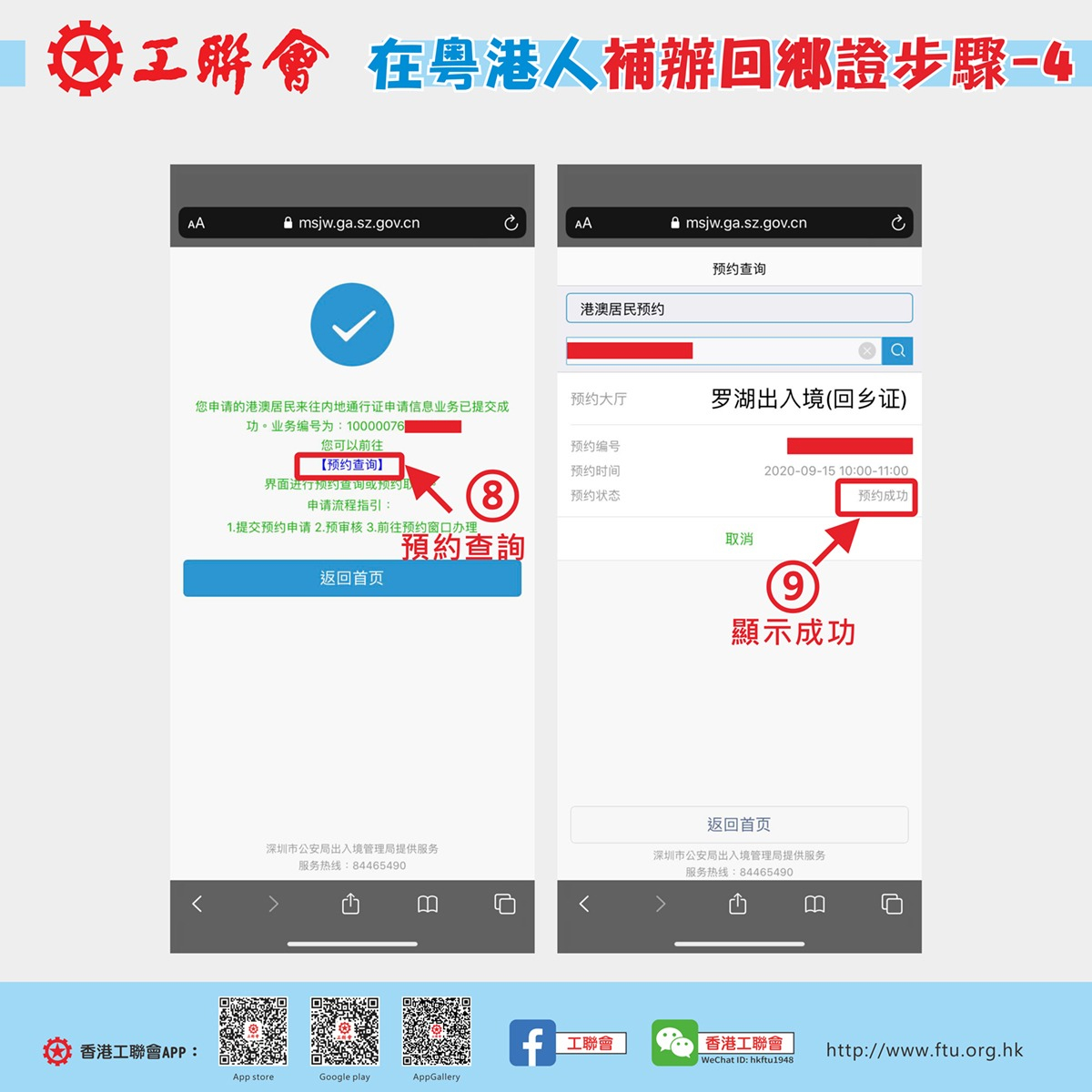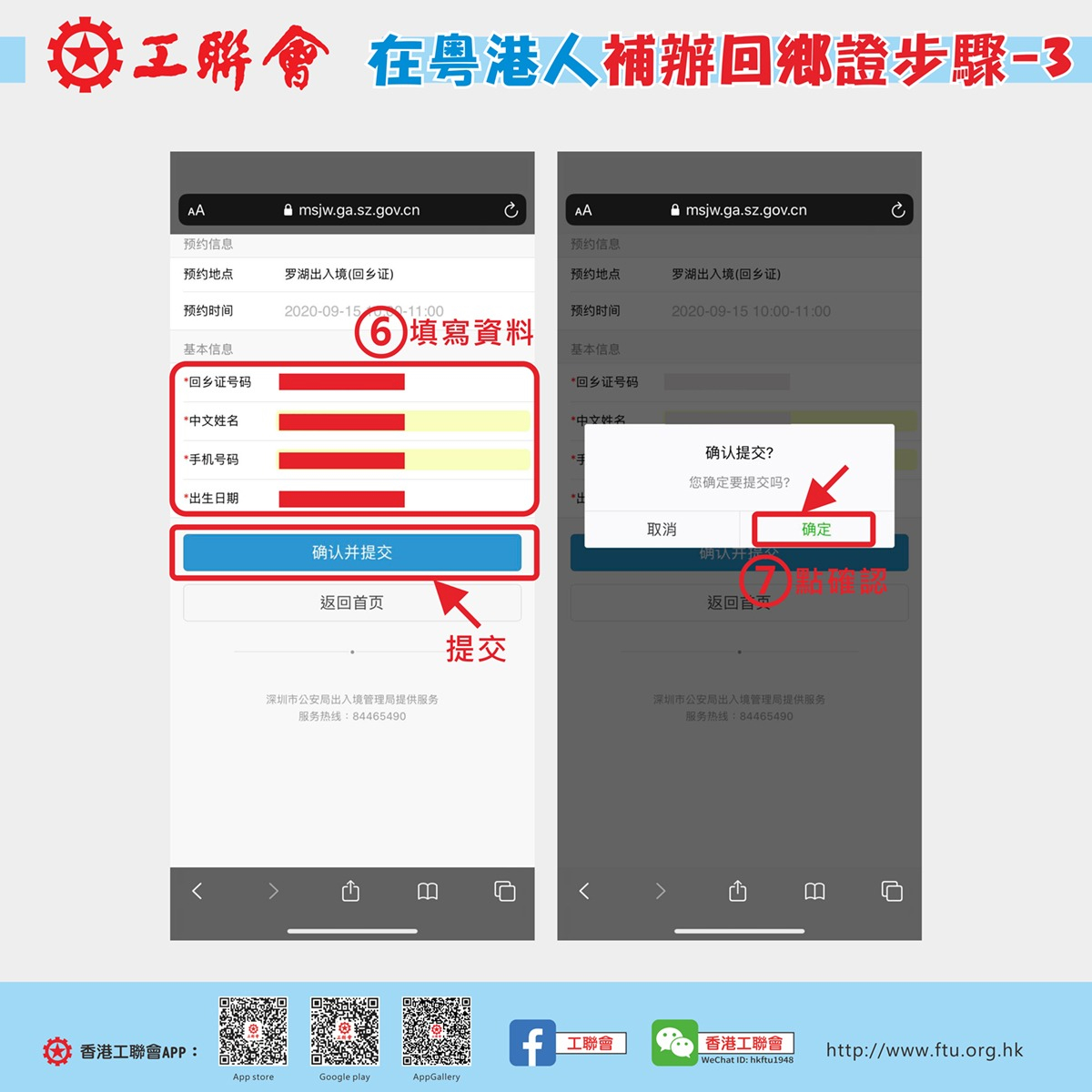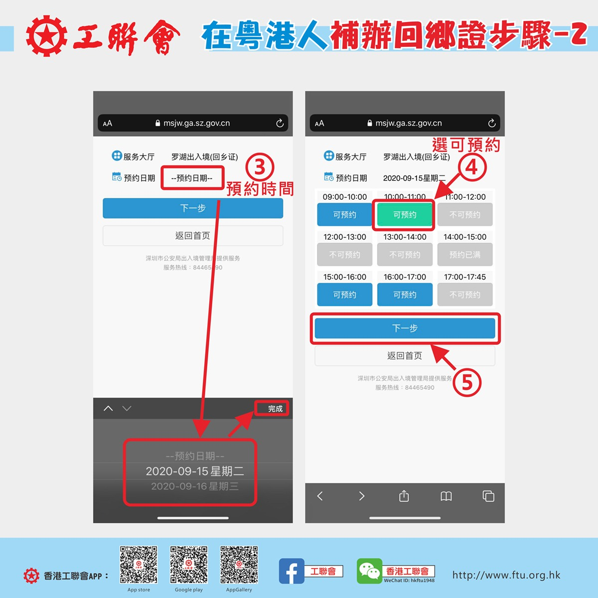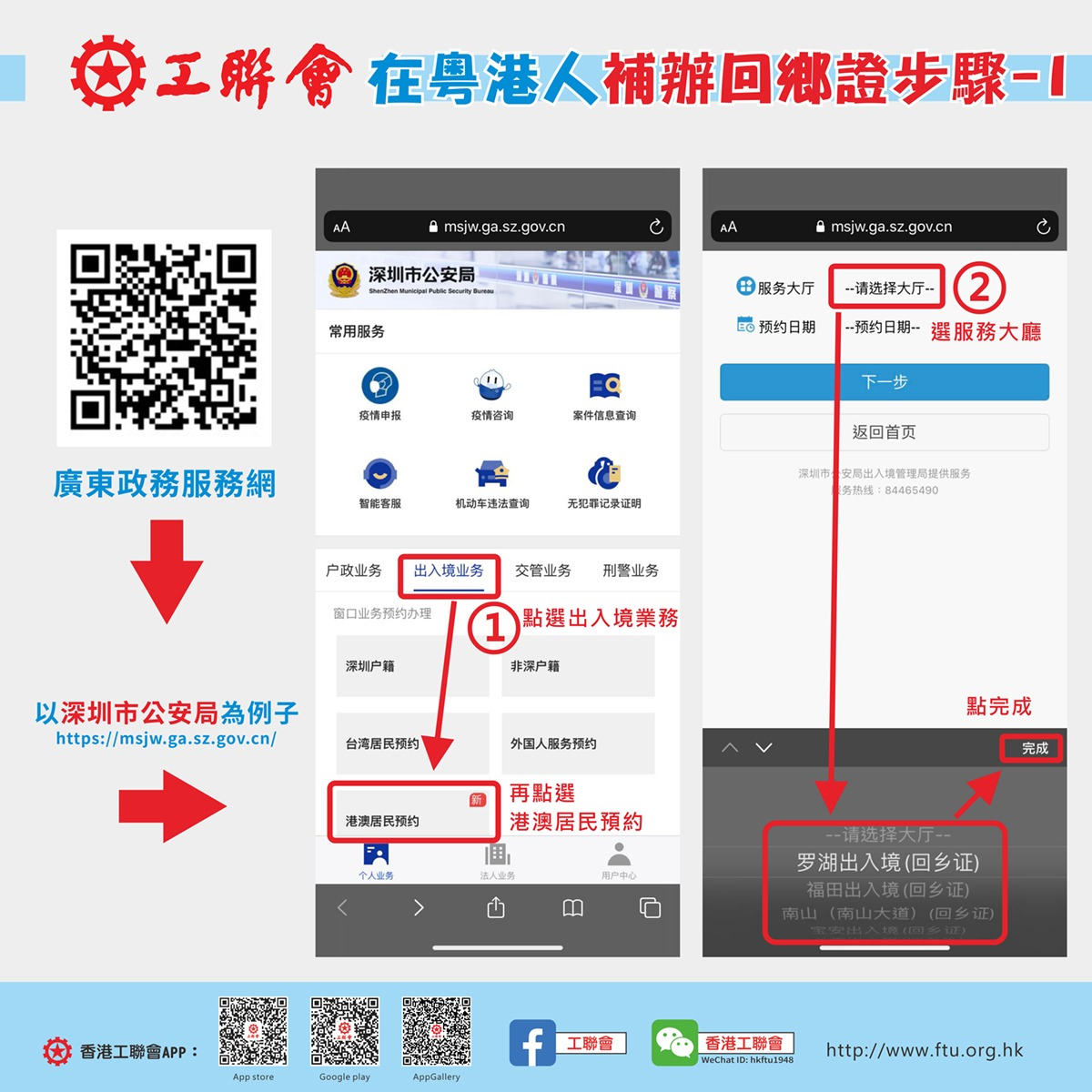 工聯會今晚在社交網站專頁發帖文,指導香港市民如何在內地補辦和換取回鄉證。如以深圳市為例,辦理人士可以先上網,並在瀏覽器輸入深圳預約鏈結 https://msjw.ga.sz.gov.cn/wxsite/weixin/cms/commonPage?template=msjw&path=/msjw_index (註:其他城市略有不同,請向當市的公安單位查詢)。