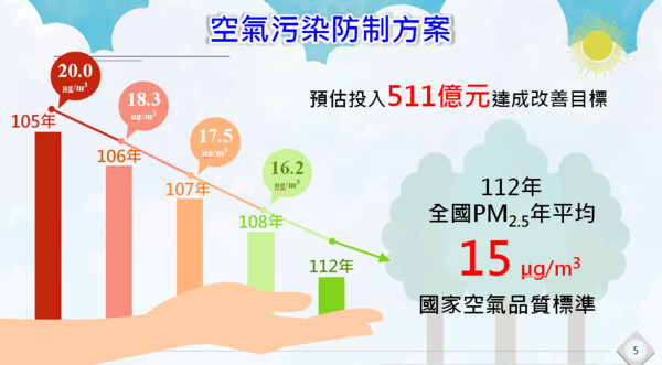 為解決空氣污染問題,台灣“行政院”10日核定,將進行4大面向共27項推動措施,4年預計經費新台幣511億元,盼在民國112年能夠達到PM2.5全國年平均濃度降低至15微克/立方公尺以下目標。