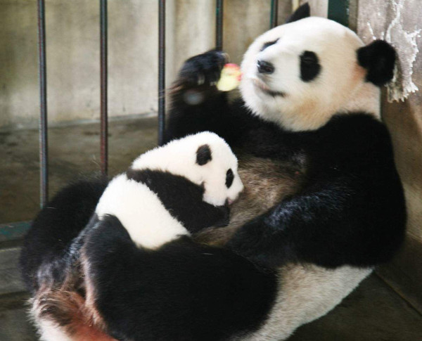 單掌大熊貓媽媽在照顧孩子時吃飯