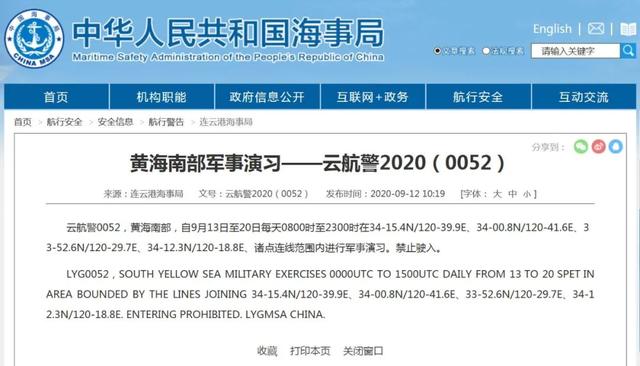据连云港海事局12日消息,云航警0052,黄海南部,自9月13日至20日每天0800时至2300时在34-15.4N/120-39.9E、34-00.8N/120-41.6E、33-52.6N/120-29.7E、34-12.3N/120-18.8E、诸点连线范围内进行军事演习。禁止驶入。