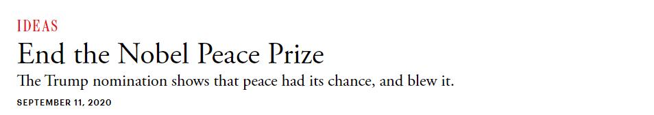 特朗普9月9日被挪威议会议员提名2021年诺贝尔和平奖,理由是参与斡旋以色列与阿联酋关系正常化。当地时间9月11日,美国《大西洋月刊》发表题为《End the Nobel Peace Prize》的文章呼吁废除该奖项,文章称“和平曾有过机会,但却被毁了。特朗普的提名就说明了这一点。”