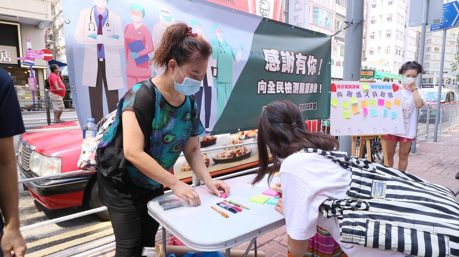 為協助本港展開普及社區檢測計劃,內地核酸檢測支援隊與本港醫護人員正日以繼夜地工作。為向他們表達衷心謝意,連日來不斷有政界人士、地區組織、熱心市民送上感謝信和心意卡。在灣仔區設立多個街站,有大批市民在心意卡上簽名。