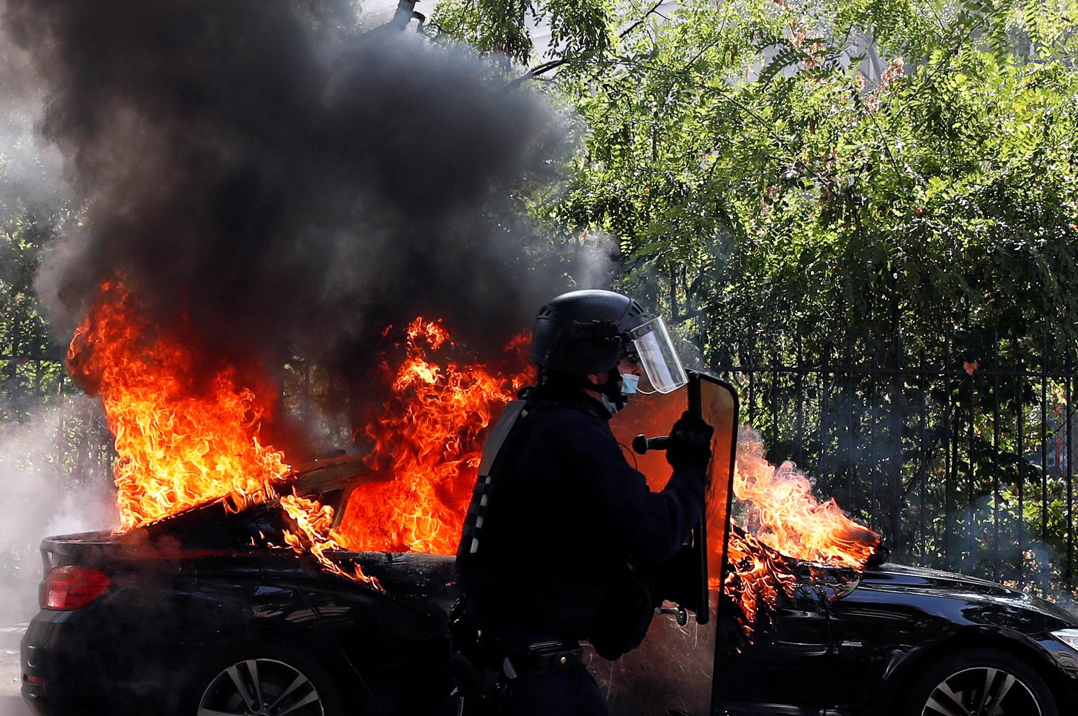 示威活动中,一名防暴警員走過一輛燃燒的汽車。 路透社
