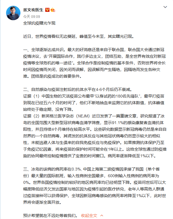 張文宏表示,全球就新冠肺炎逐漸達成共識,聯合國大會通過新冠疫情決議,他認為全球合作是控制疫情的基本條件,否則世界將會長時間因疫情而關閉,因關閉而誤解,因誤解而產生隔絕,因隔絕而發生各種災難,「團結是抗疫成功的首要條件。」
