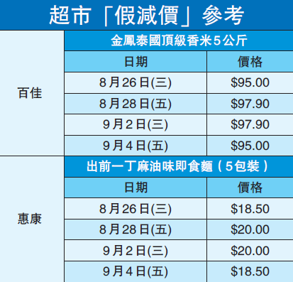 超市「先加後減」情況多年來並沒有改善。以百佳「金鳳泰國頂級香米5公斤」為例,8月28日及9月2日售價均為97.9元,到9月4日價格為95元,看似減價2.9元、減幅2.96%。但其實百佳早於8月26日的售價已經是95元。