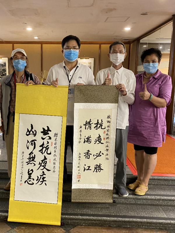 劉英烈激動的緊握龐主任的手說 :「感謝祖國派來的親人醫療隊,無懼艱辛為香港市民服務。」並送上自己的書法作品「抗疫必勝 情滿香江」各位老師也紛紛拿出自己的創作作品給醫療隊以表示我們市民一點心意,並遵守政府的限聚令4人一組拍照留念。(記者 何家驊)