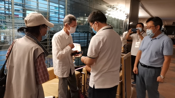 昨午5時,中華傳統文化交流協會副主席黃秀培率部分老師、著名書法家劉英烈(96歲)、馬啟文(86歲)、著名重彩畫家張文漢(72歲)、著名畫家張國安,4位老師均拿著自己的作品,到九龍維景酒店送贈內地支援隊以表謝意,並獲廣西衛健委副主任龐軍(領隊)、呂向劼(副領隊)和廣西區統戰部施勇等接見。