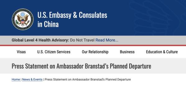 在美国国务卿蓬佩奥14日连发3条推特评价美驻华大使引发美媒纷纷猜测之後,14日晚间,美国驻华大使馆官网发布了《关於布兰斯塔德大使计划离任的新闻声明》。声明称,美国驻华大使布兰斯塔德将於10月离任,其上周与美国总统特朗普通话确认了这一决定。