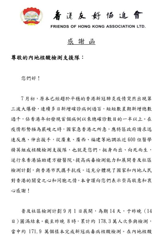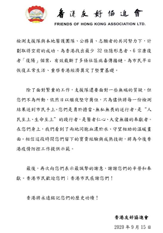 香港友好協進會表示,在第三波疫情形勢極為嚴峻之時,國家急香港之所急,應特區政府請求迅速反應、伸出援手,從廣東、廣西、福建等地調派近600位醫學精英組成核酸檢測支援隊,「挺身而出、向死而生」,逆行來香港協助建方艙醫院、提高病毒檢測能力和展開普及社區檢測計劃,與香港市民攜手抗疫。